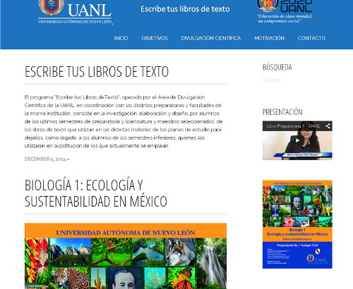 El programa “Escribe tus Libros deTexto”, operado por el Área de Divulgación Científica de la UANL, en coordinación con las distintas preparatorias y facultades de la misma institución, consiste en la investigación, elaboración y diseño, por alumnos de los últimos semestres de preparatoria y licenciatura y maestros seleccionados, de los libros de texto que utilizan en las distintas materias de los planes de estudio para dejarlos, como legado, a los alumnos de los semestres inferiores, quienes los utilizarán en substitución de los que actualmente se emplean.